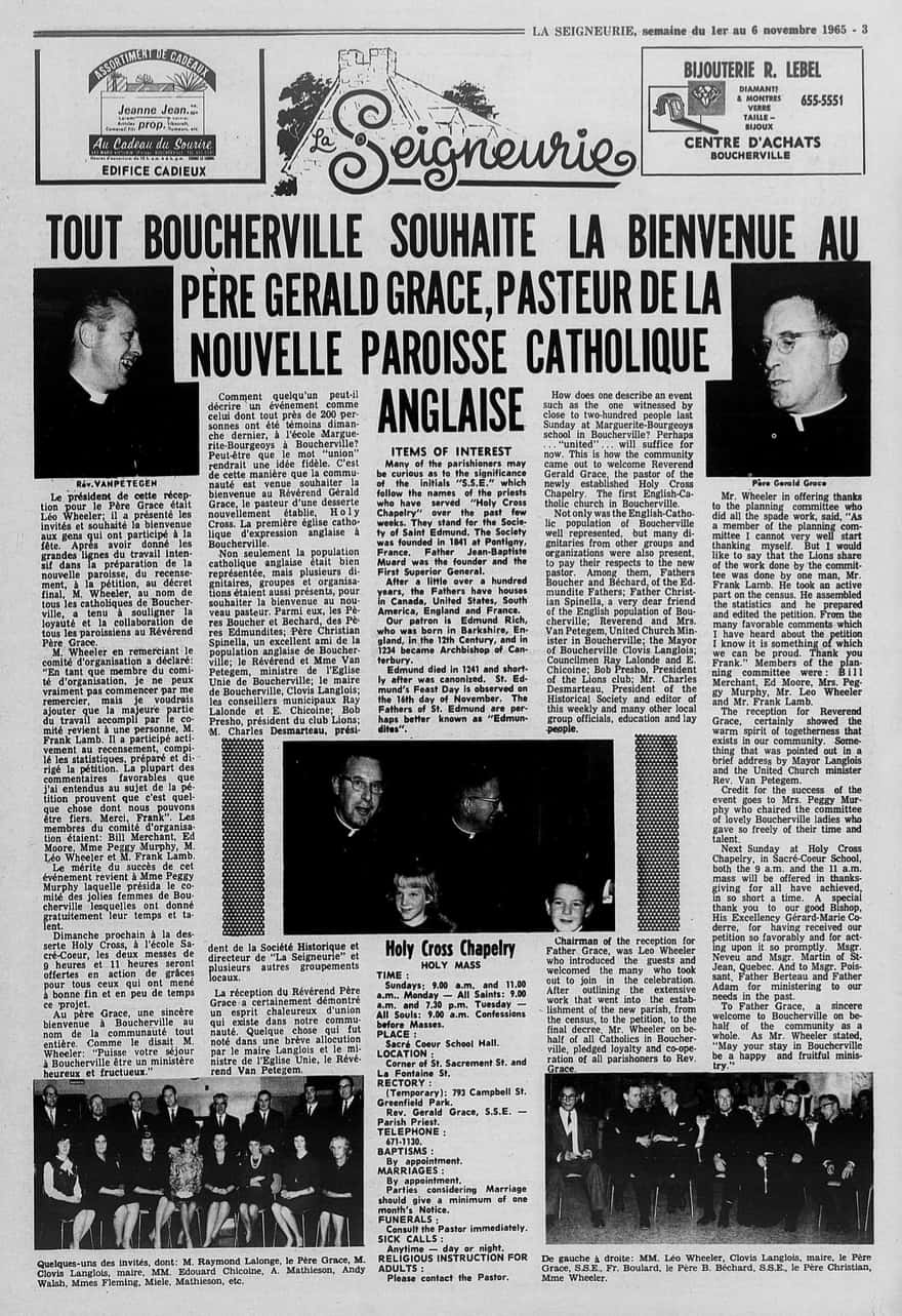 De son côté, depuis 1965, la communauté catholique anglophone était regroupée au sein de la paroisse Holy Cross Parish et la plupart de ses offices religieux avaient lieu à l'école Marguerite-Bourgeoys et la chapelle de l'école Sacré-Coeur du village. En 1976, la fabrique acquiert le bâtiment qui servait de temple à la communauté protestante et en fait sa chapelle.