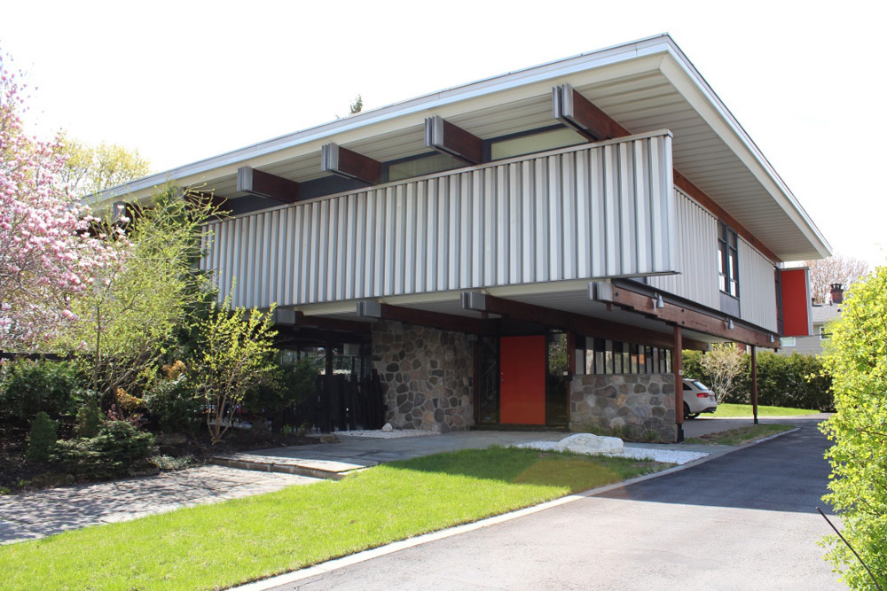 Maison construite rue Bachand à Boucherville, en 1951, selon le plan de l'architecte Roland Dumais qui avait remporté en 1947 le premier prix pour le Québec à un concours de la SCHL pour les architectes canadiens tel qu'illustré dans la publication «67 Homes for Canadians» de la SCHL. .